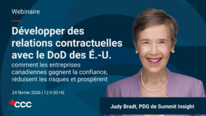 Dans ce webinaire, Judy Bradt, PDG de Summit Insight, démystifie le processus contractuel du DoD des É.-U. et explique comment les entreprises canadiennes peuvent s’aligner sur les priorités contractuelles sans faire de présentation, sans exagérer leurs arguments de vente et sans prendre de risques inutiles.