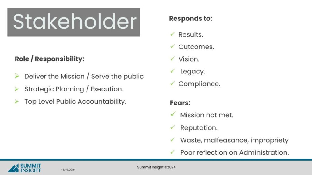 Comme les chefs d’entreprise, les parties prenantes sont visionnaires et souvent préoccupées par l’héritage qu’elles laisseront à leurs successeurs. Cependant, ils sont également très attentifs à la conformité et au risque de ne pas rencontrer la mission de l’agence. Ils veillent à éviter le gaspillage, la fraude et toute action susceptible d’avoir un impact négatif sur leur agence ou sur l’administration.